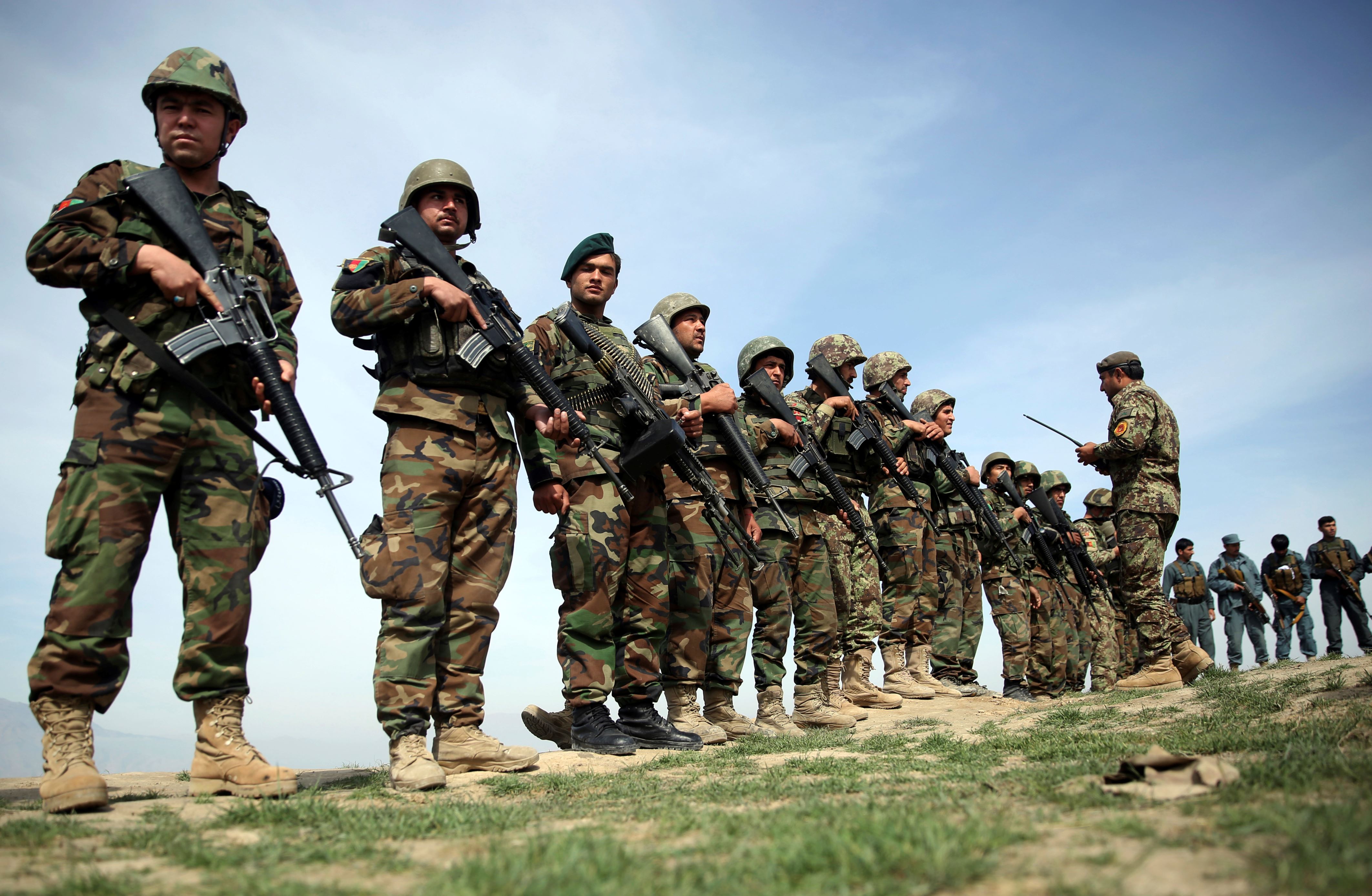 | © AP In this Tuesday, Mar. 15, 2016 file photo, Afghanistan's National Army soldiers stand guardin Dand-e Ghouri district in Baghlan province, north of Kabul, Afghanistan. |