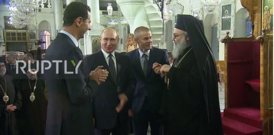 ‘If Trump arrives along this road, everything will become normal with him too,’ Assad laughs to Putin during the trip to the Orthodox Church of the Virgin Mary in Damascus.